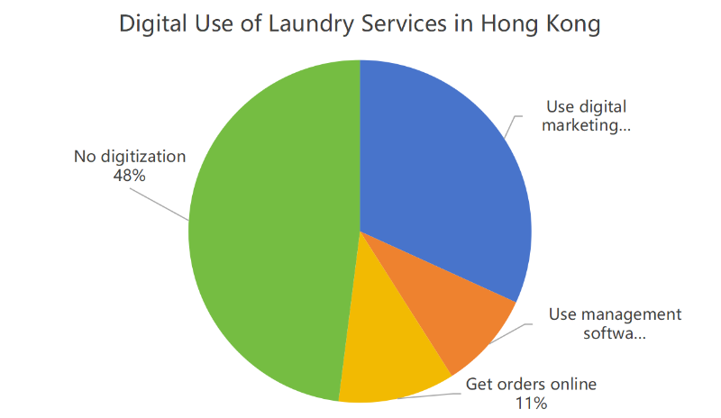 Prema rezultatima naše ankete, digitalna transformacija Hong Konga ' Industrija pranja rublja još je u povojima. Među tvrtkama koje su odgovorile, 48% nije koristilo digitalne aplikacije, mrežni sustav za primanje narudžbi praonica rublja činio je oko 11%, a sustav upravljanja skladištenjem narudžbi kupaca, RFID sustav, sustav upravljanja odnosima s kupcima, sustav upravljanja logističkim informacijama i ERP sustav činili su manje od 10%. Pa mi ' poduzima veliki potisak za digitalnu transformaciju.